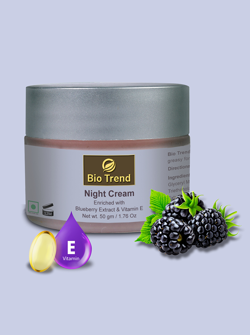 Bio Trend Night Cream (Blue Berry Extract & Vitamin E) nourishes, brightens, repairs, and rejuvenates the skin. It is a non-greasy formula that gets absorbed into the skin easily.